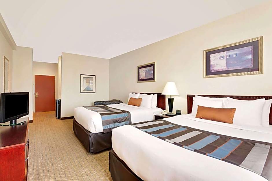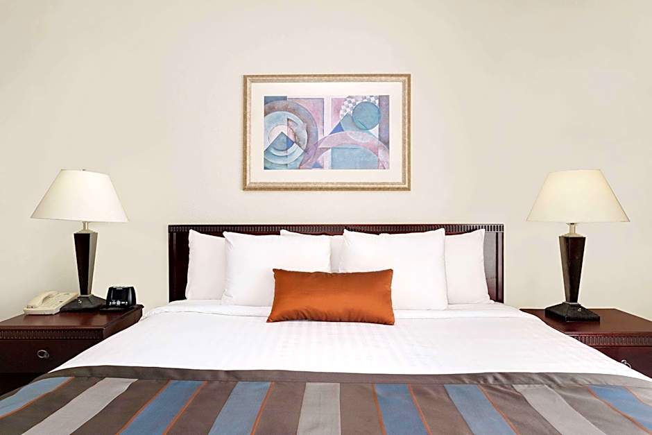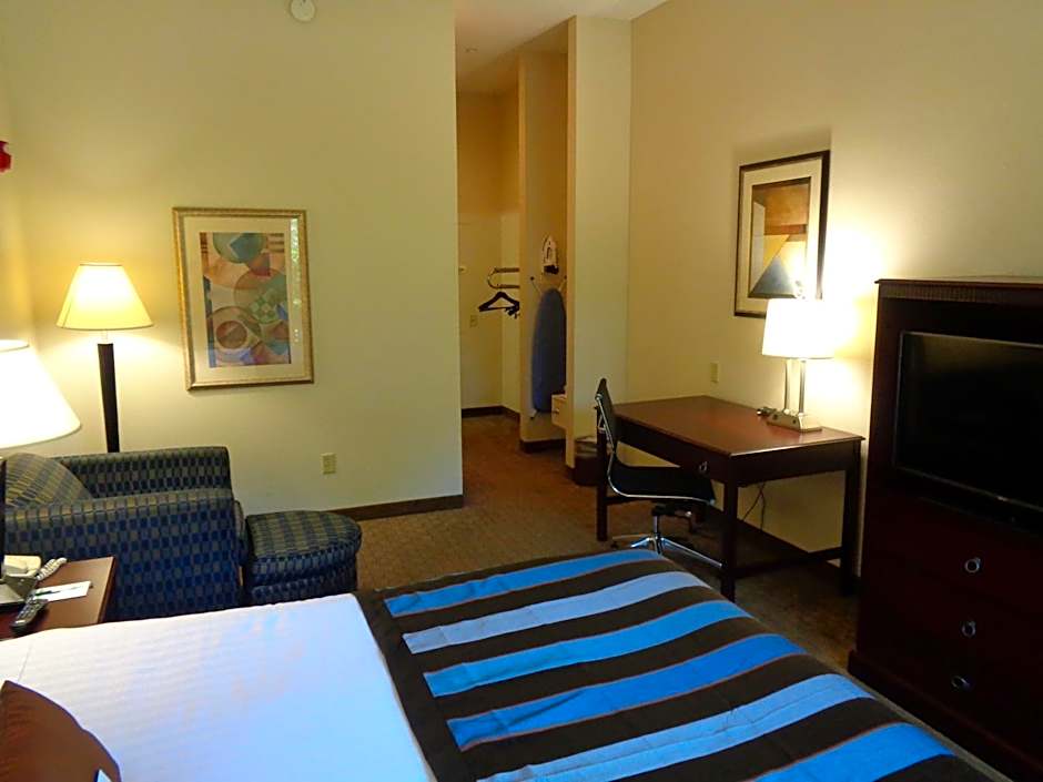 This suite has a living area with a sofa bed, flat-screen TV, and desk. The room also includes a microwave, small refrigerator, and private bathroom.
