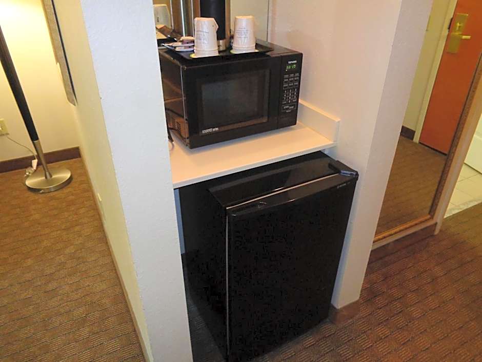 This room has a flat-screen TV, desk, and microwave. A small refrigerator and a private bathroom are also included.