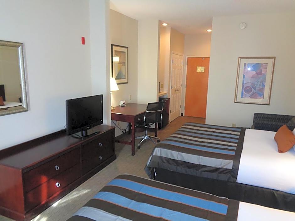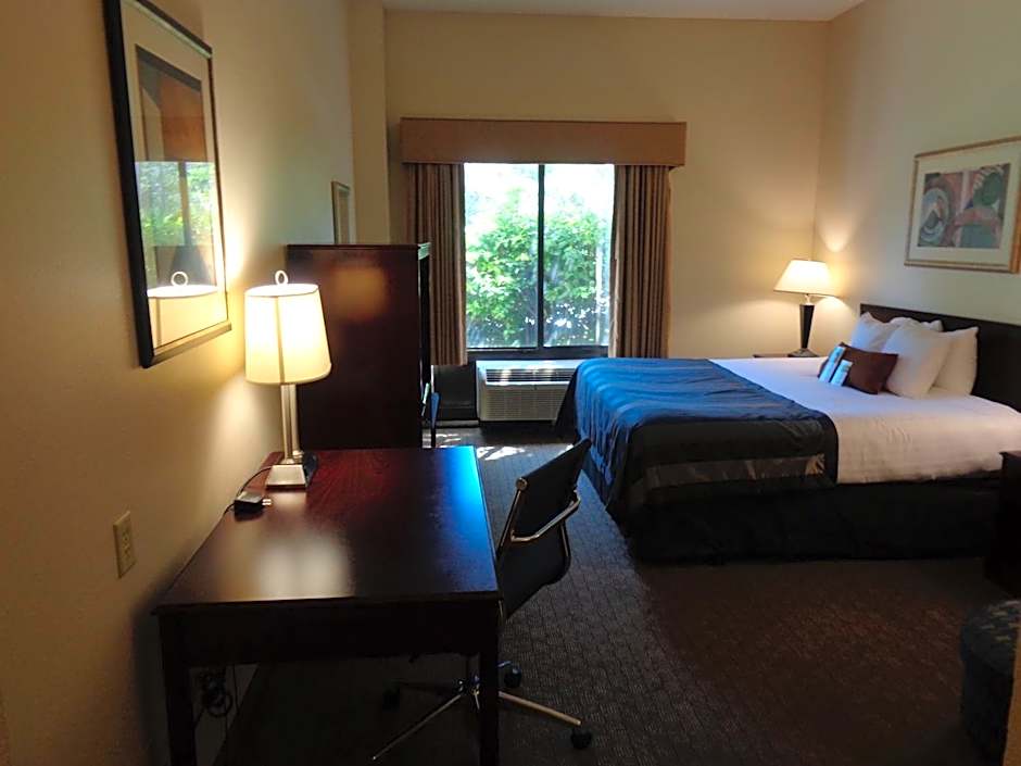 This room has a flat-screen TV, desk, and microwave. A small refrigerator and a private bathroom are also included.